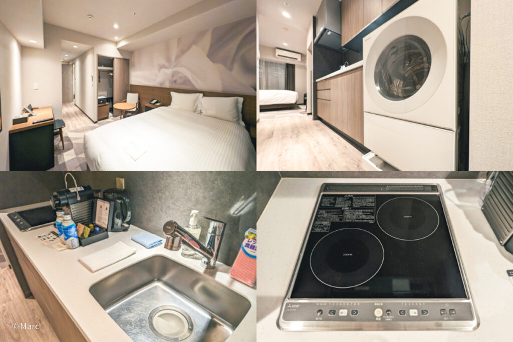 キッチン、電子レンジ、ドラム型洗濯機が揃っていて、まるで高級マンションに住んでいるような感覚に。暮らすように旅をしてみたい方にぴったりです。