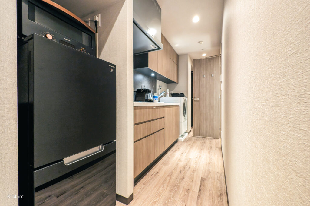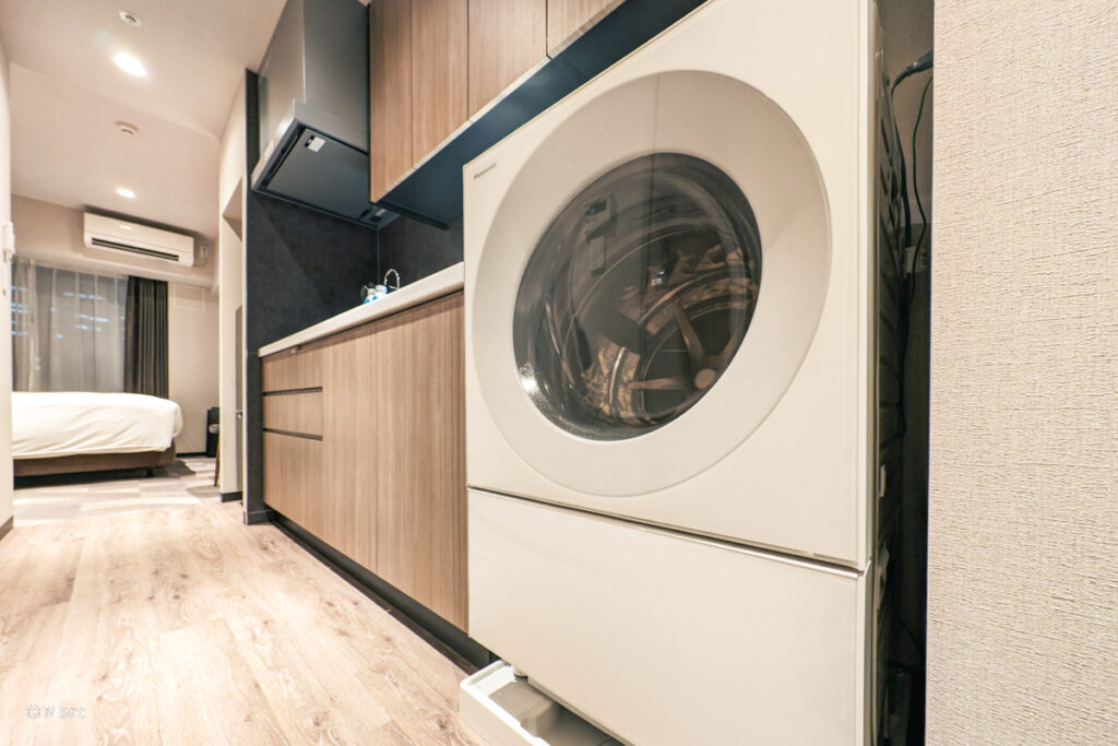 客室に入ってすぐ、ドラム型洗濯乾燥機があります。マンションスタイルのホテルならではの設備です。