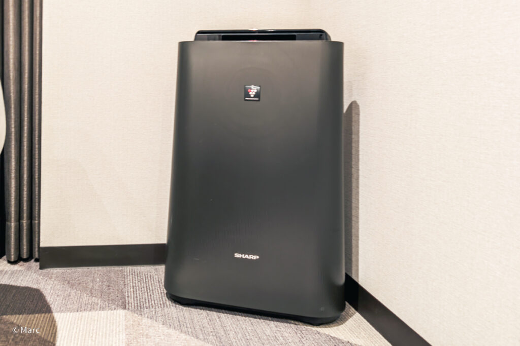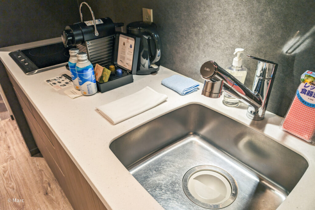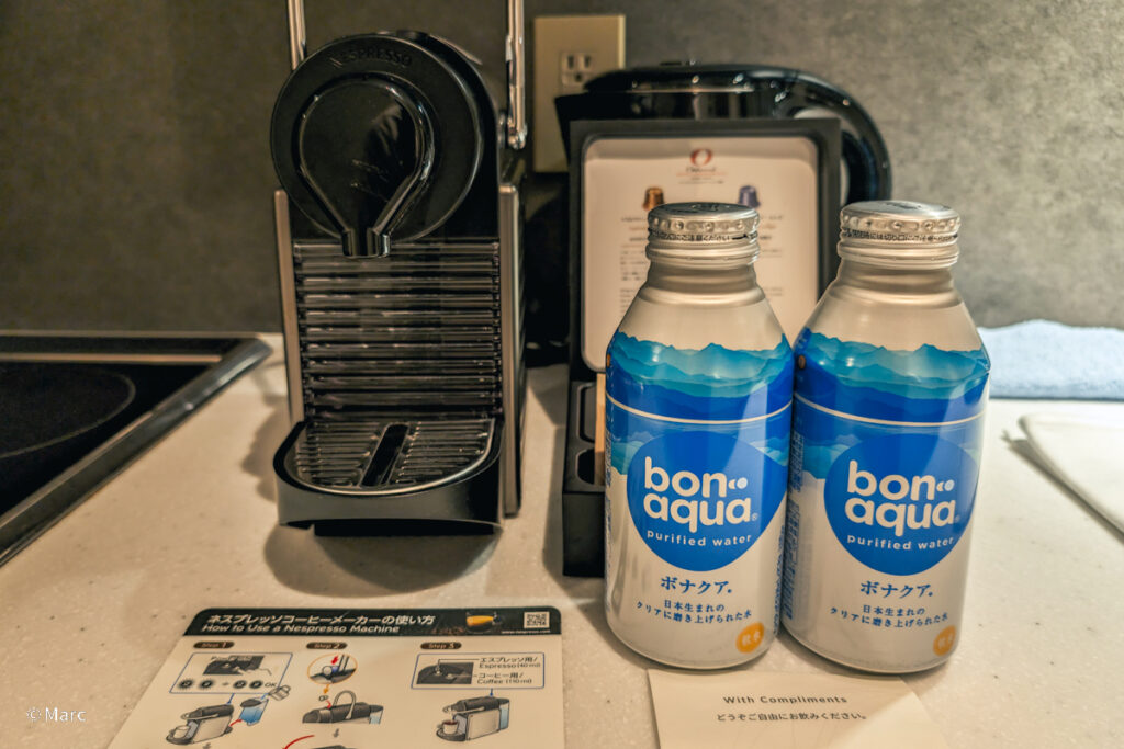 キッチンのIHコンロ横には、コーヒーメーカーとサービスのミネラルウォーター。空気清浄機もバルコニー横に標準設置です。