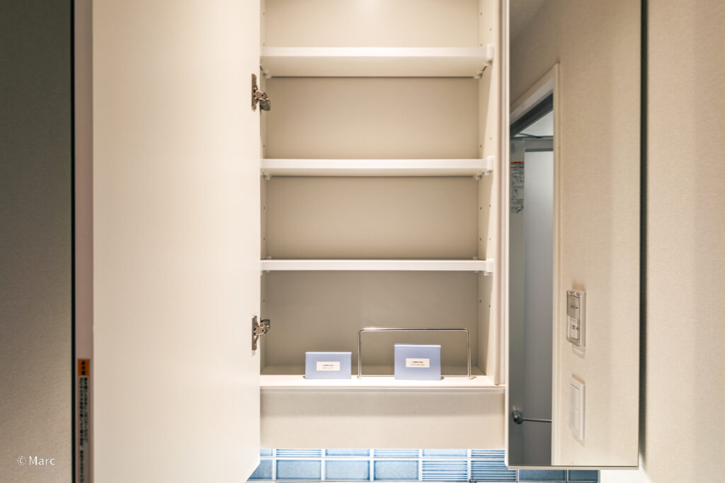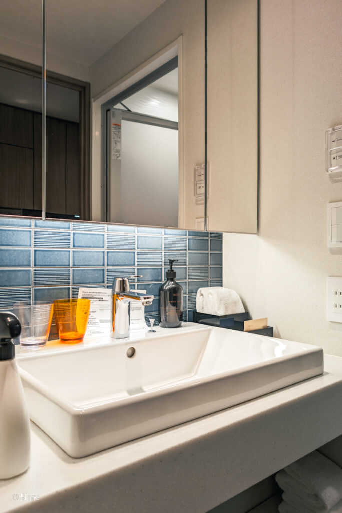 洗面台はブルーのタイルがアクセントになっていい感じ。上部収納は宿泊では不要なレベルの収納量です。