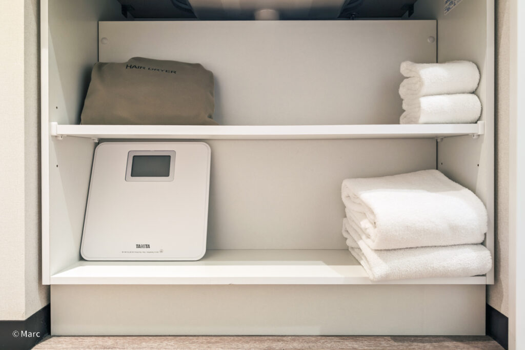 洗面台下のスペースには、ドライヤー・体重計・タオルが設置されています。