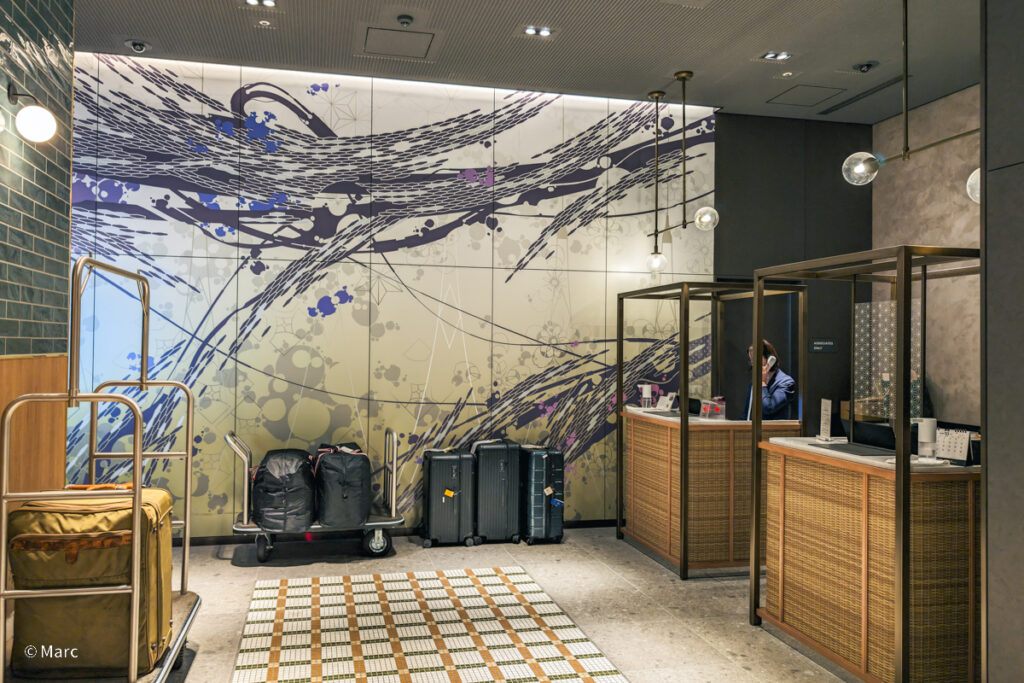和を取り入れたモダンな雰囲気のフロント。こちらで手荷物を預かってもらえるので活用しましょう。