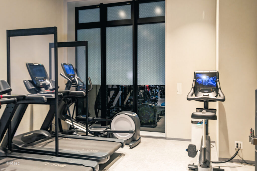 宿泊者は無料かつ24時間いつでも利用可。有酸素マシーンやダンベルで軽い運動ができます。