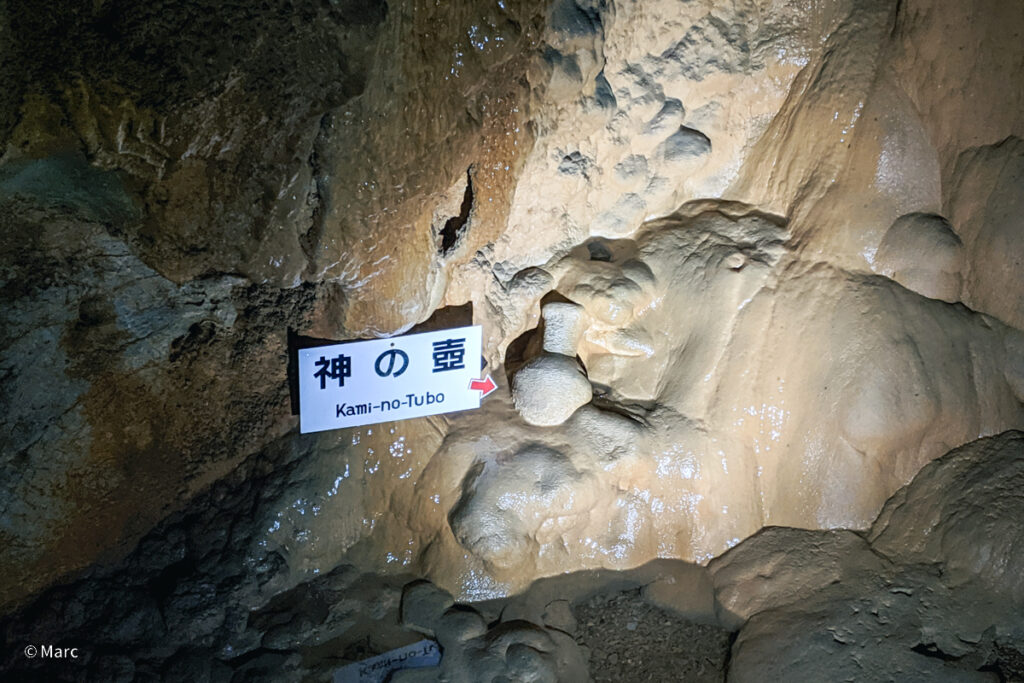 龍河洞には、弥生時代の土器が鍾乳石に包まれたまま残る「神の壺」と呼ばれる遺構があります。