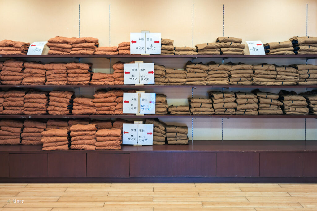 館内は非常にスッキリとした印象。受付で料金を支払ったら、隣りにある館内着コーナーから自分に合うサイズのものを選びます。