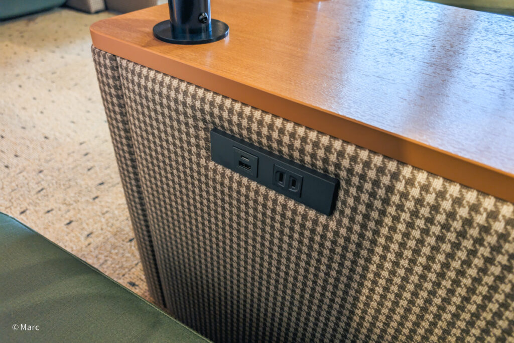シート右手側にはコンセントがあり、スマホを充電したり、PCを使ったりできるので便利です。