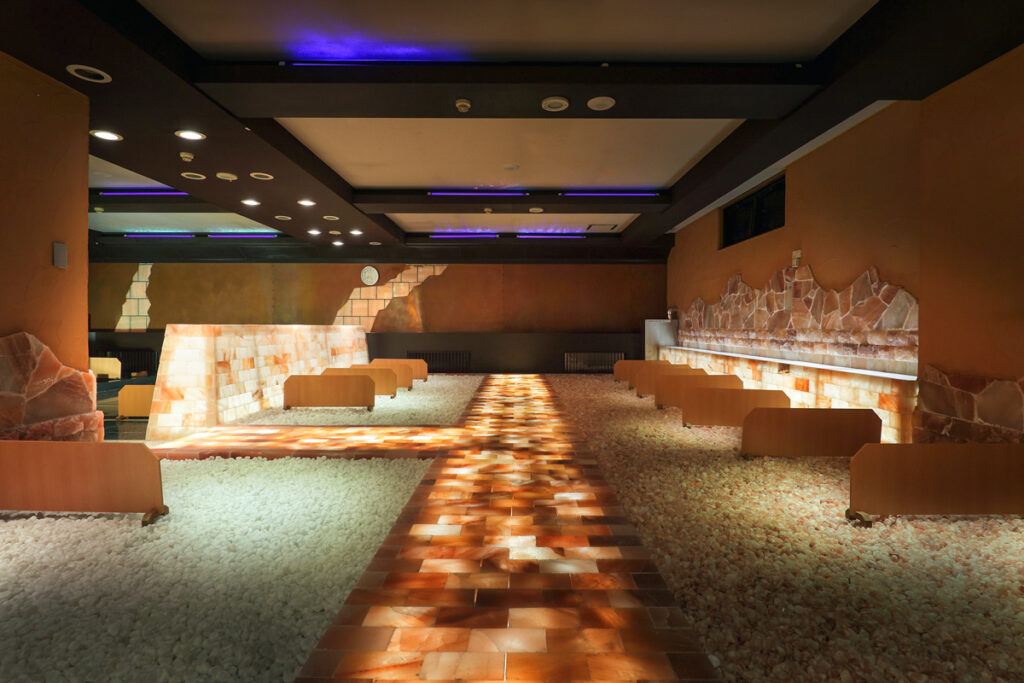 約45度の室内には、ヒマラヤ岩塩、ゲルマニウム鉱石、ブラックゲルマニウム鉱石の3種類からなる鉱石ベッドがあります。