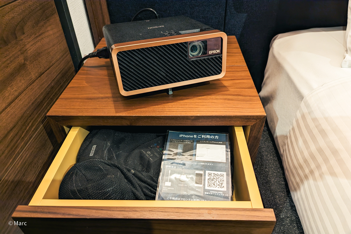 名前の通り、大画面プロジェクターも設置されています。備品も一式揃っていて、接続マニュアルがあるのも親切。