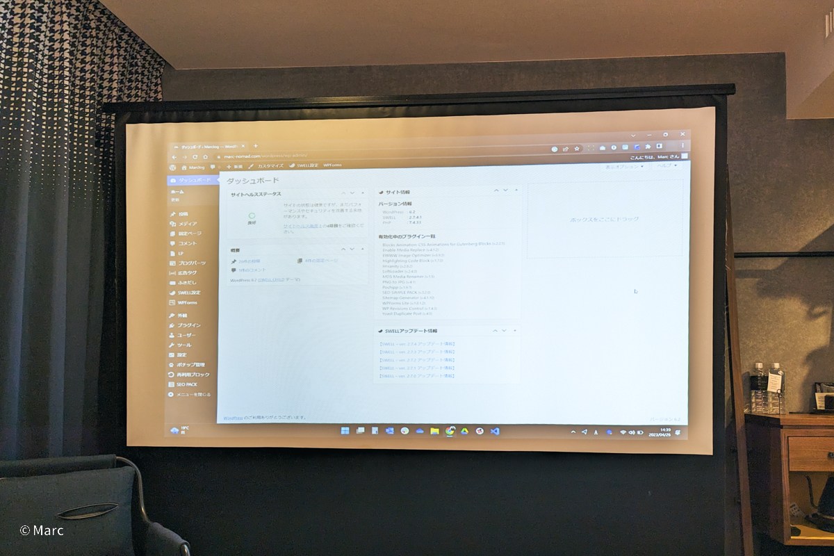 こんな感じで、PC画面をスクリーンに投影でき、スマホ画面のミラーリングも可能。