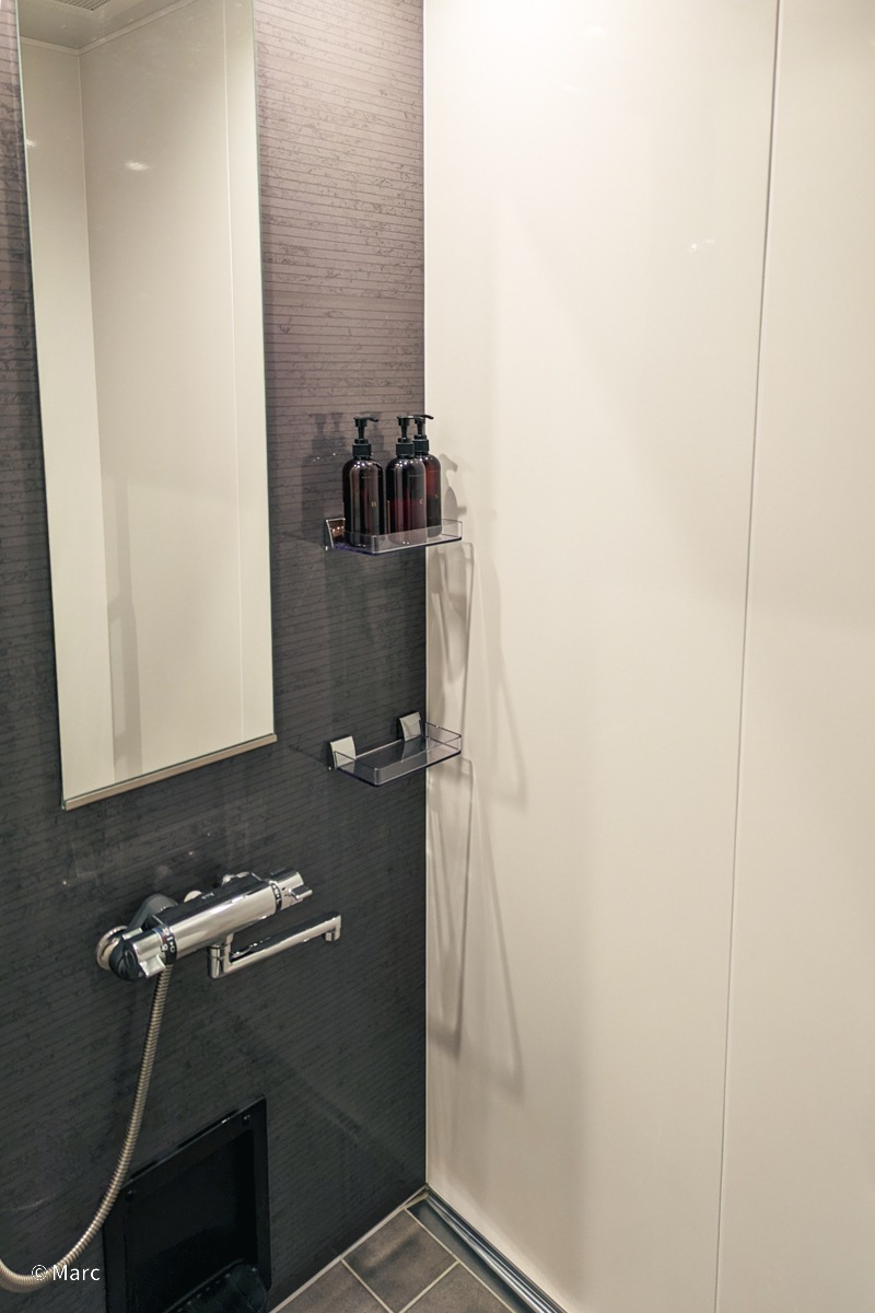 お風呂はバスタブがなく、シャワーとアメニティが設置されているシンプルなつくり。