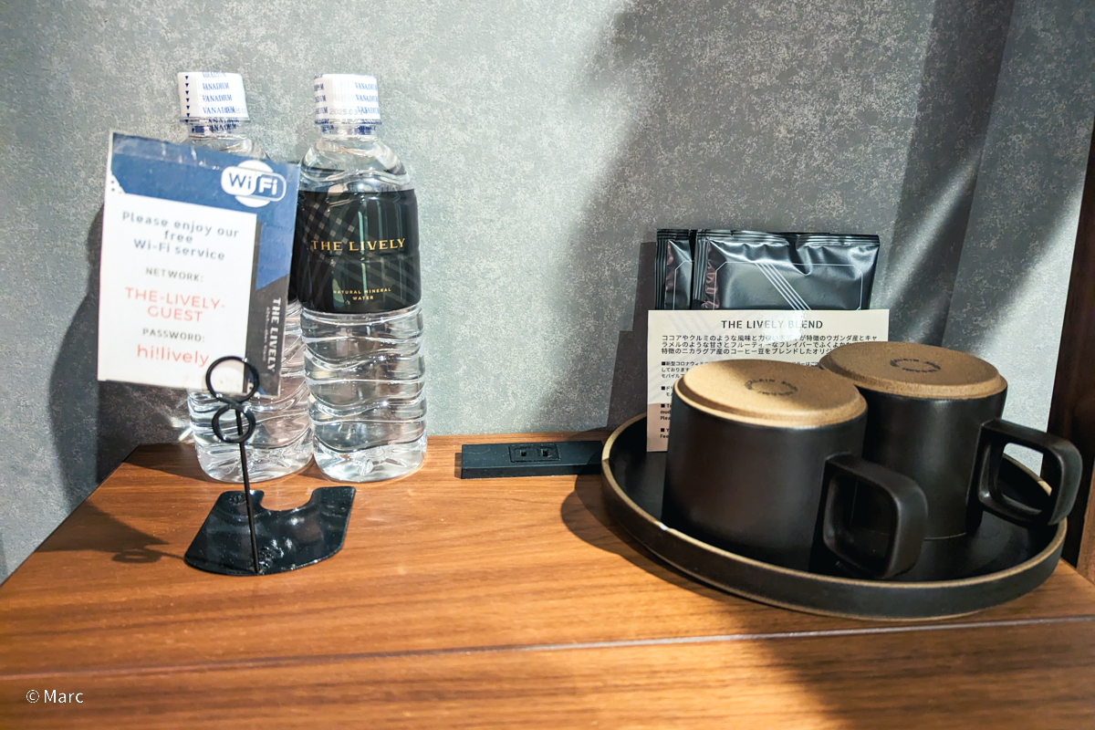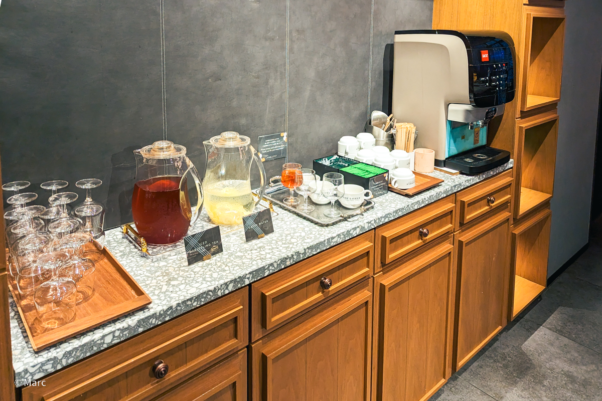 デトックスウォーター、コーヒ、紅茶、緑茶などがあるので、セルフサービスでいただくことができます。