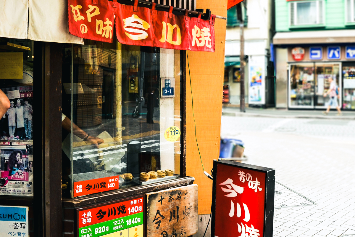 麻布十番名物と言われる今川焼き店。もちもちとした黒糖入りの生地に焼印が特徴です。味は小倉・カスタード・チーズの3種類あります。